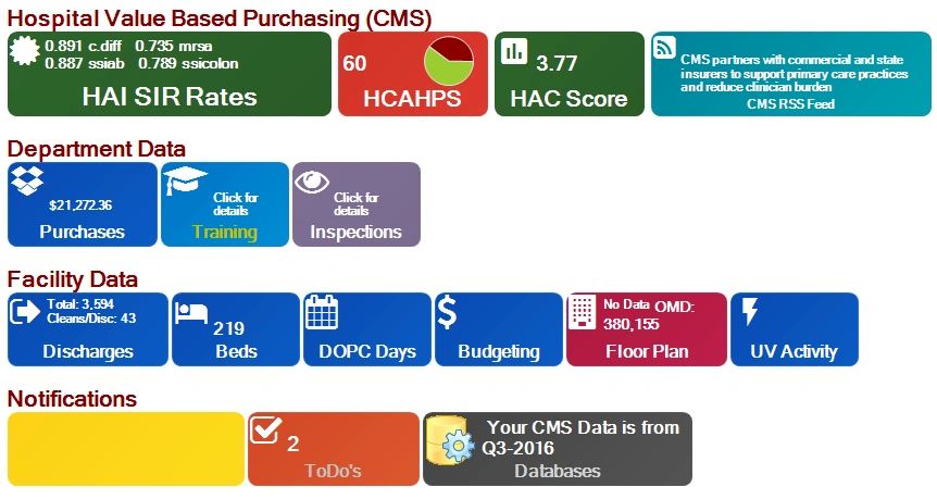 | See your facilities HAI rates, and HAC and HCAHPS scores. With human resource integration, view the training status and CDC inspection audits of your cleaning professionals. With integrated housekeeper task and space management, see task lists and utilization rates at a glance. |
