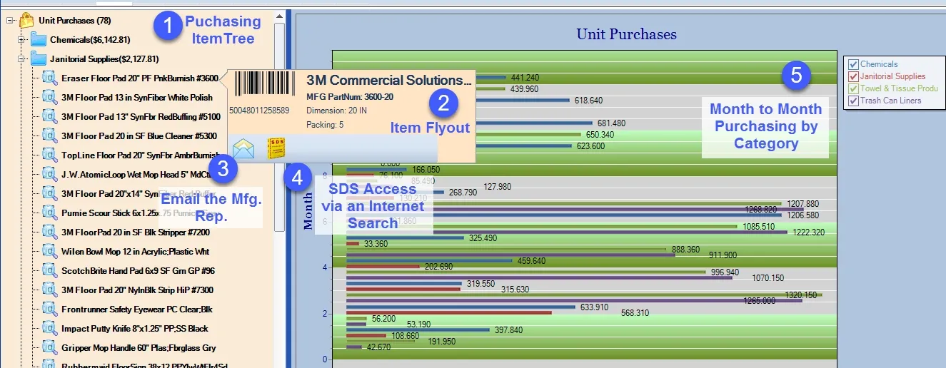 Illustration: Purchasing data can be viewed by category and by month. The flyout offers specific product information, email to the manufacturing representative, and an internet search for the Safety Data Sheet for the selected item.